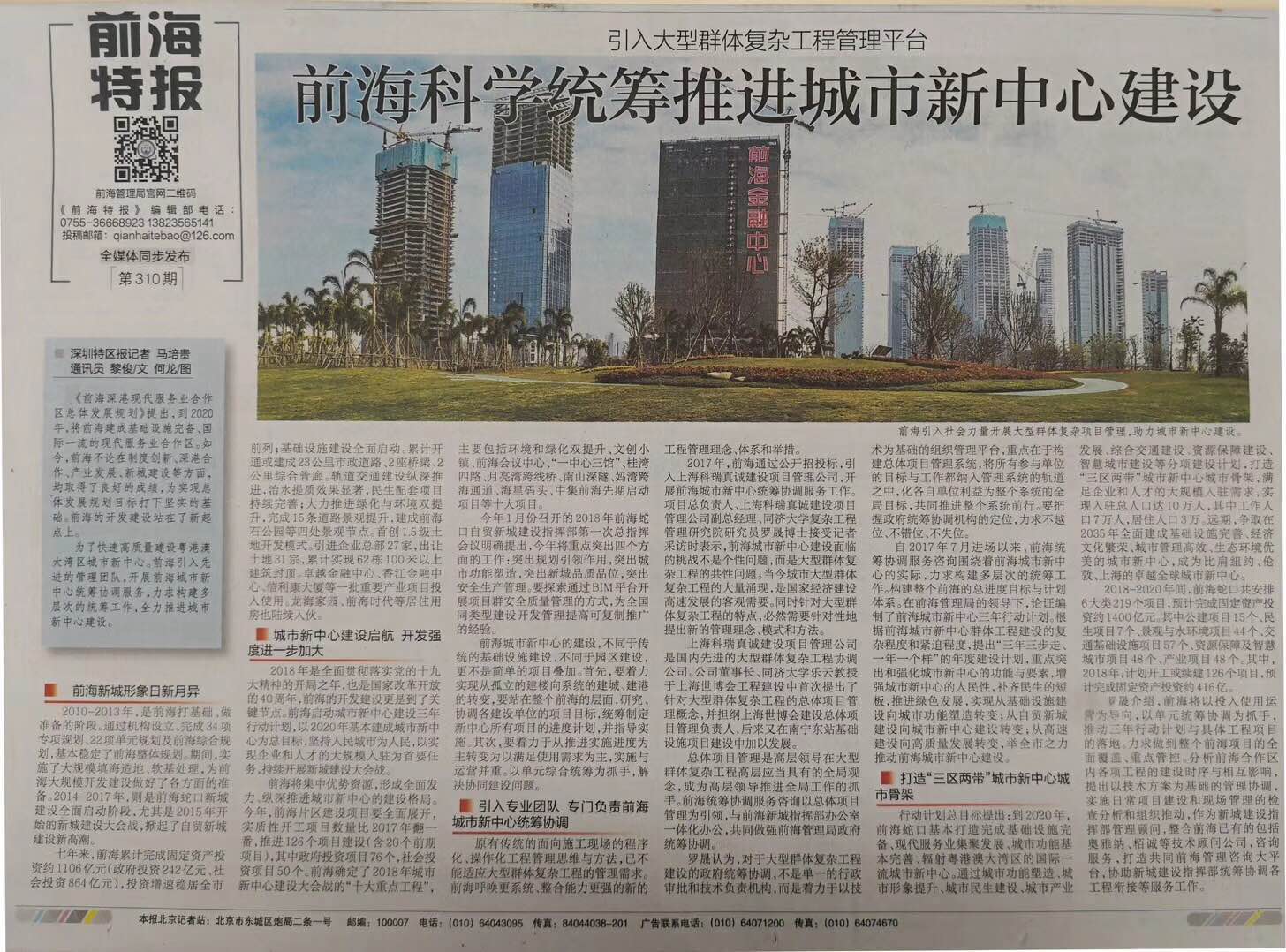 2018年4月13日,《深圳特区报》在当日发行的第6版,撰文《引入大型群体复杂工程管理平台——前海科学统筹推进城市新中心建设》对我司深圳前海统筹协调服务平台项目负责人、公司副总经理罗晟博士进行了专访,对本项目进行了深度报道。