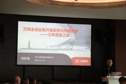 第四位分享者是万邦工程管理咨询有限公司项目管理板块主理人姚欧强,他带来了《万邦全咨业务开垦拓荒与持续探索——三年启发之旅》的分享。他详细分析了企业发展中的三大挑战:“大船转向(企业转型)”、“蜀中无大将(人才培养)”、“少爷与管家(全过程咨询服务咨询单位角色)”。应对这些挑战,全咨企业应该认识非正式沟通的必要性、让定价权的转移与有序回归,让数智赋能与知识萃取发力,形成投资管控为核心的全过程工程咨询。