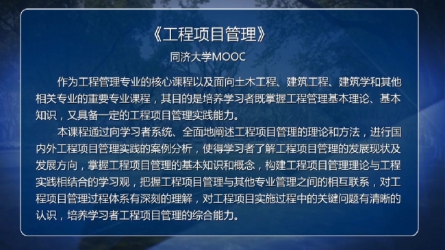 《工程项目管理》是工程管理专业的核心课程,也是面向土木工程、建筑工程、建筑学和其他相关专业的重要专业课程。在此次课程中,不仅能系统全面地学习工程项目管理的理论知识,更能了解国内外工程项目管理的实践案例,培养学员们工程项目管理的综合能力。
