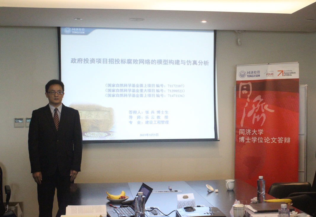 2015年5月5日下午,我院博士研究生张兵的博士答辩仪式在研究院会议室913室举行。答辩主席由上海交通大学曾赛星教授担任,答辩委员会成员包括上海财经大学姚玲珍教授、东华大学郑建国教授、同济大学陈建国与何清华教授。博士论文研究聚焦点为政府投资项目招投标阶段的腐败问题,通过模拟仿真模型构建与仿真分析研究招投标阶段腐败网络的理论模型、计算模型、网络结构分析以及打击策略选择等。经评审小组评议,一致同意张兵博士生通过毕业答辩。