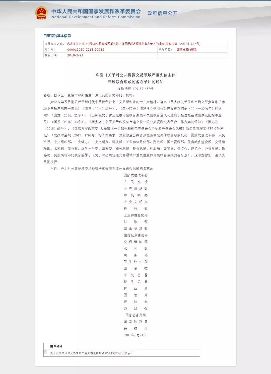 2018年3月21日,国家发展改革委、住房和城乡建设部等二十四个部委联合印发《关于对公共资源交易领域严重失信主体开展联合惩戒的备忘录》的通知(发改法规〔2018〕457号),明确出现以下行为的企业将被限制“参与工程建设项目招标投标”和“政府采购活动”。