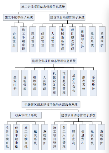 政务审批及建设项目动态管理信息系统可以分为:建设方建设项目网上服务系统、施工企业项目动态管理信息系统、监理企业项目动态管理信息系统和无锡新区规划建设环保局内部政务系统四个子系统。总体功能框架及各子系统功能框架如下: